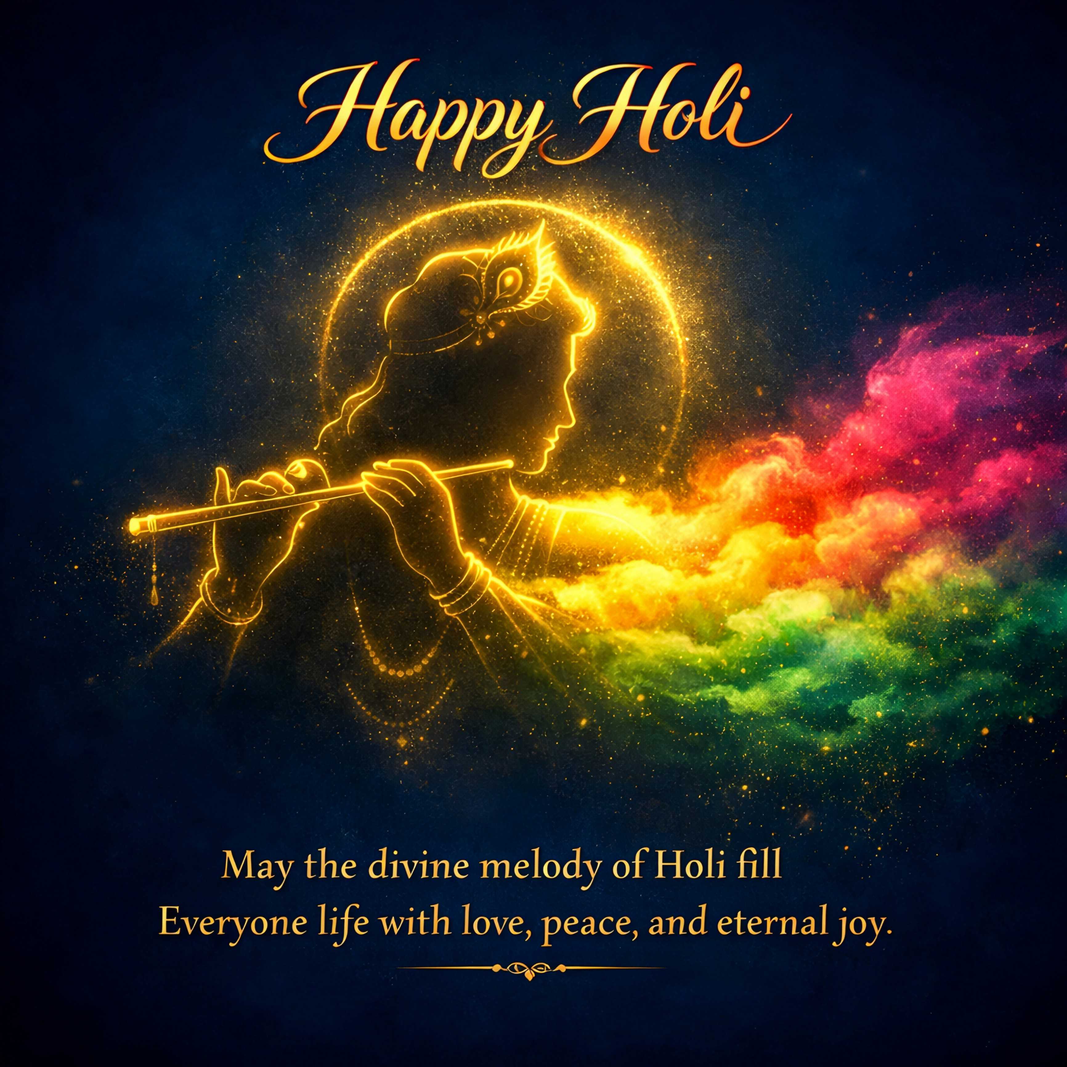 This HD image features a golden Krishna with colorful gulal clouds in the background and the main text “Happy Holi” along with a beautiful quote about love, peace, and eternal joy. The divine and festive design creates a powerful Holi celebration look, perfect for sharing heartfelt wishes. Ideal for the queries: happy holi wishes, holi celebration quotes, holi quotes, happy holi quotes, happy holi wishes hd. Download this for free and it is also Copyright free with no attribution required.