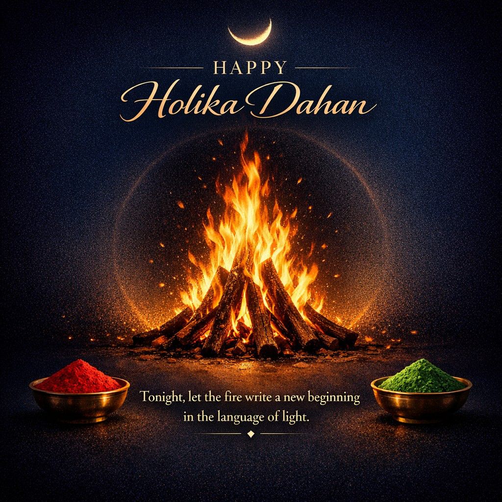 This HD image features a glowing Holika Dahan bonfire under a crescent moon, vibrant bowls of red and green gulal on each side, and a warm festive ambiance, with the main text “Happy Holika Dahan.” Perfect for wishes on happy holi dehan, happy holika, holika dahan, happy holika dahan, holi dahan, holika dahan quotes. Download this for free, And It is also Copyright free – with no attribution required.