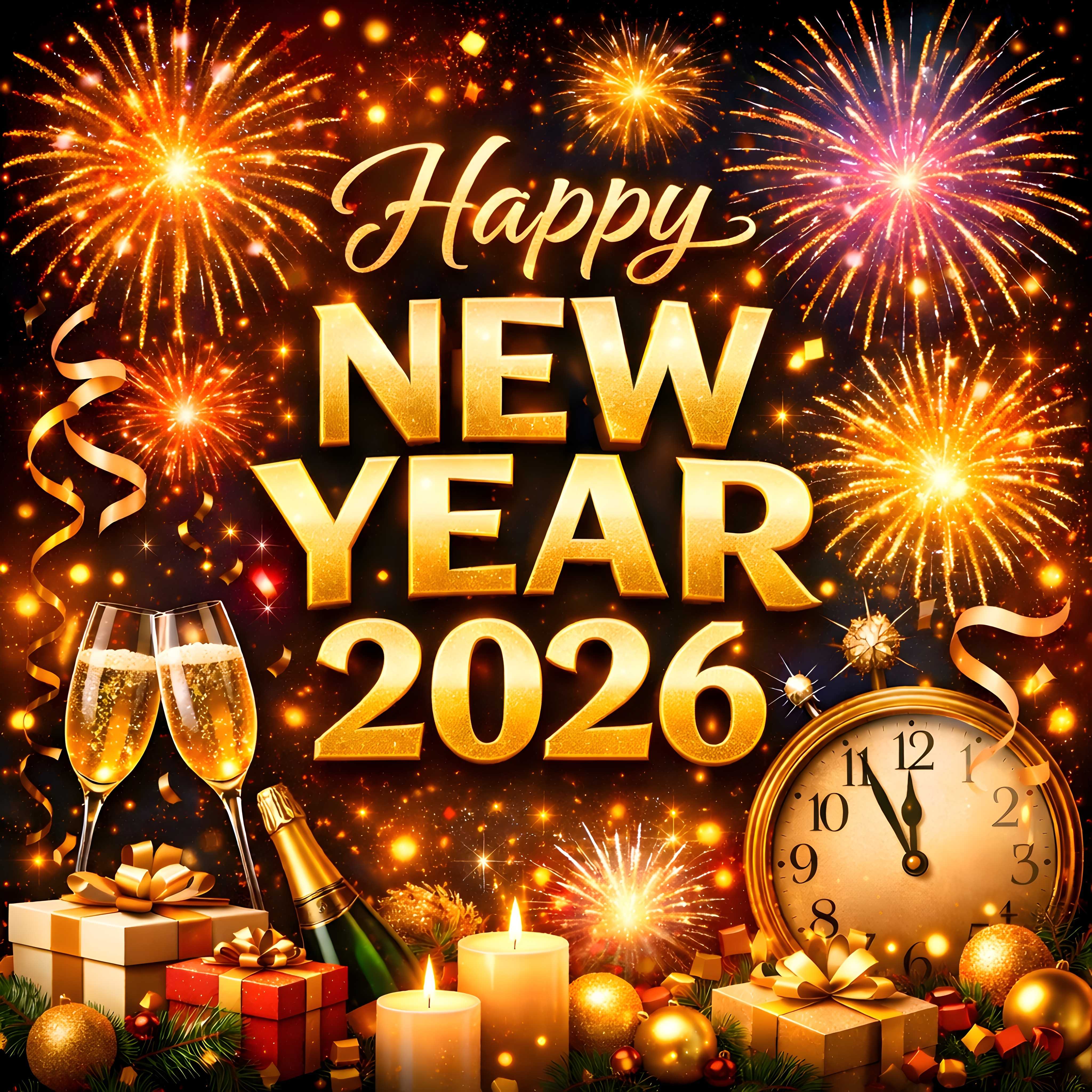 This HD image features fireworks, champagne, gifts, and a clock counting down to midnight. The primary text in the image is “Happy New Year 2026. Perfect for happy new year 2026 wishes image . Download this for free and It is also Copyright free—no attribution required.