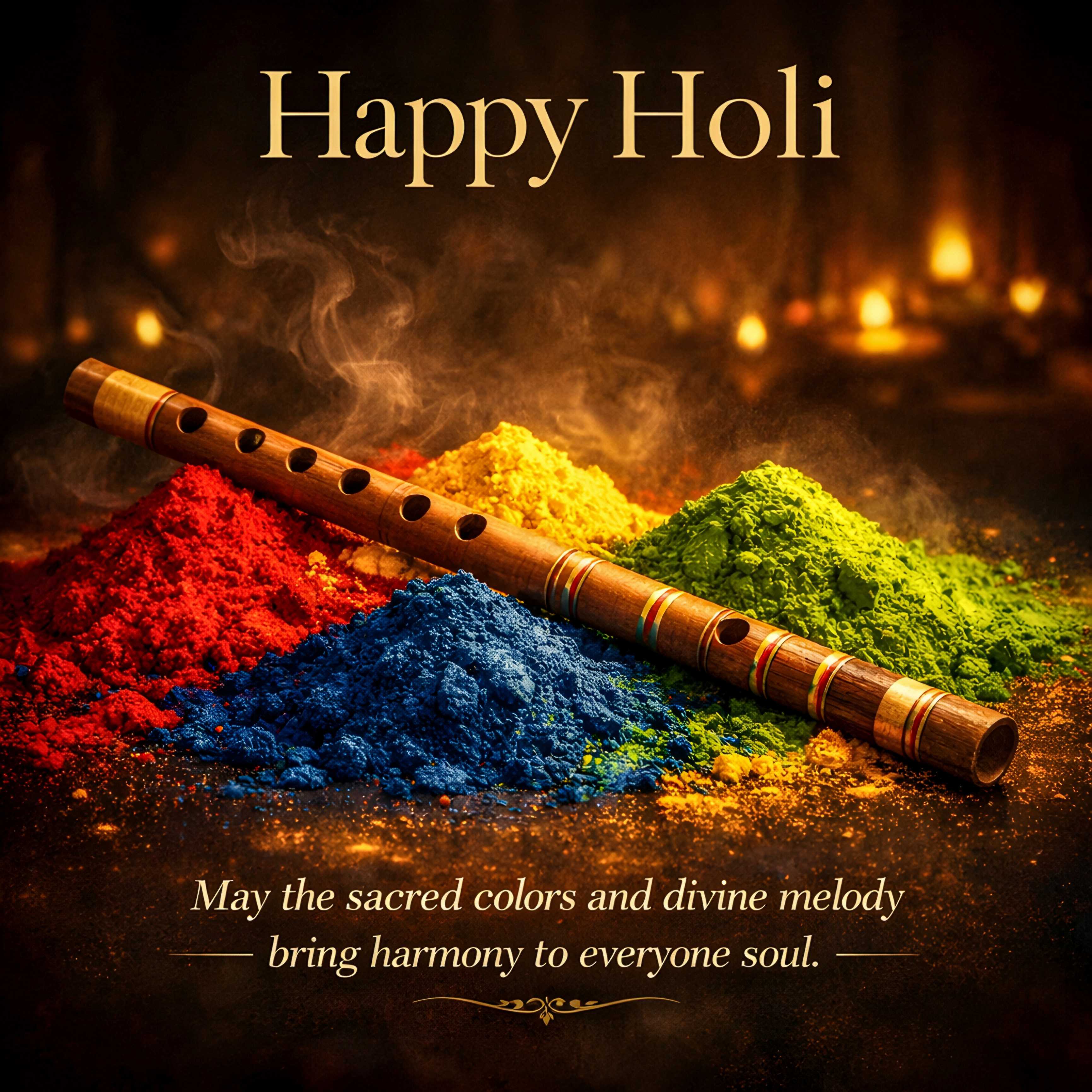 This HD image features a flute with colorful gulal in the background and the main text “Happy Holi” along with a beautiful quote about harmony and divine blessings. The soft festive colors and spiritual theme create a meaningful Holi celebration look, perfect for sharing divine wishes. Ideal for the queries: holi quotes, holi quotes in english, happy holi wishes, happy holi wishes hd, happy holi quotes. Download this for free and it is also Copyright free with no attribution required.